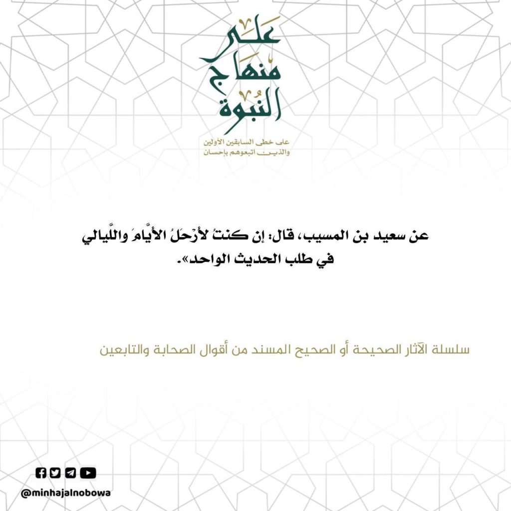عن سعيد بن المسيب، قال: إن كنت لأرْحَلُ الأيَّام واللّيالي في طلب الحديث الواحد». سلسلة الآثار الصحيحة أو الصحيح المسند من أقوال الصحابة والتابعين