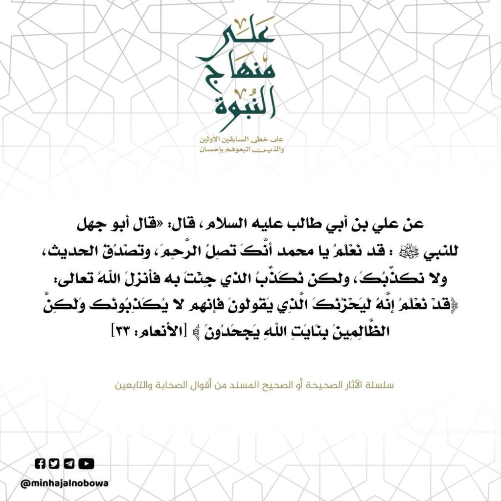 عن علي بن أبي طالب عليه السلام، قال: «قال أبو جهل للنبي ﷺ : قد نعْلَمُ يا محمد أنَّكَ تصِلُ الرَّحِمَ، وتصْدُقُ الحديث، ولا نكذِّبُكَ، ولكن نكذِّبُ الذي جِئتَ به فأنزلَ الله تعالى:…