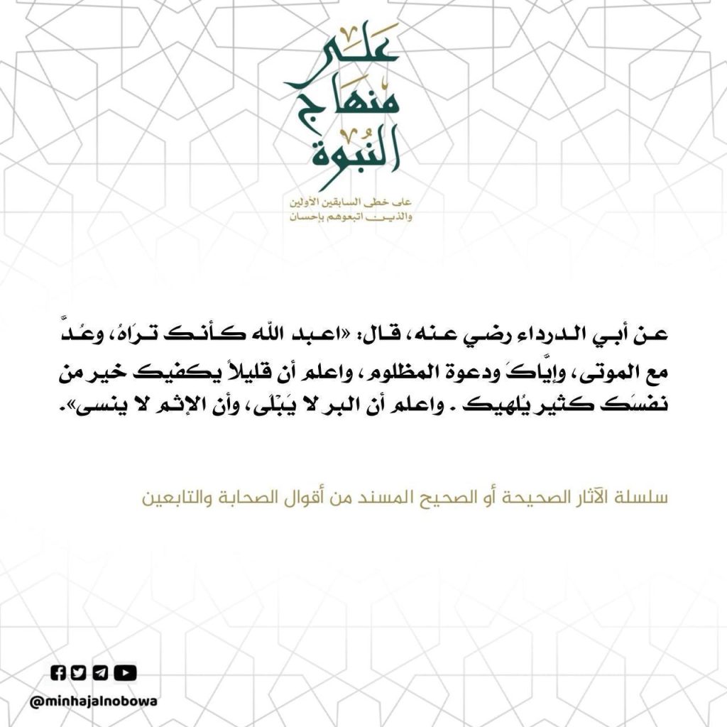 عن أبي الدرداء رضي عند قال: «اعبد الله كأنك تراهُ، وعُدَّ مع الموتى، وإيَّاكَ ودعوة المظلوم، واعلم أن قليلاً يكفيك خير من نفسك كثير يُلهيك . واعلم أن البر لا يَبْلى، وأن الاثم…