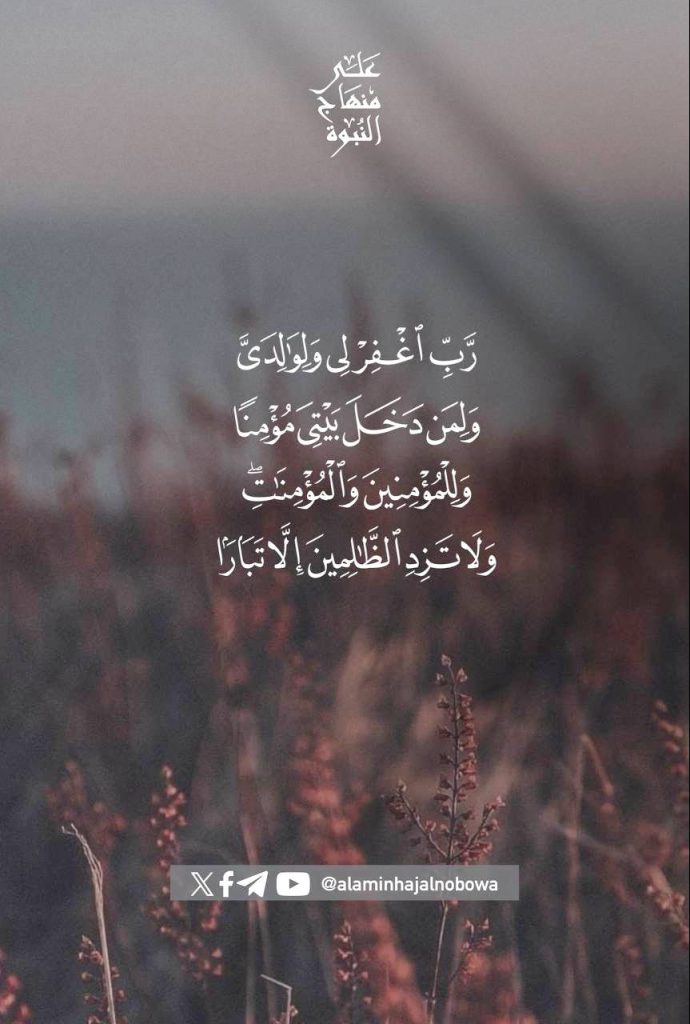 ﴿ رَّبِّ اغْفِرْ لِي وَلِوَالِدَيَّ وَلِمَن دَخَلَ بَيْتِيَ مُؤْمِنًا وَلِلْمُؤْمِنِينَ وَالْمُؤْمِنَاتِ وَلَا تَزِدِ الظَّالِمِينَ إِلَّا تَبَارًا﴾ [ نوح: 28]