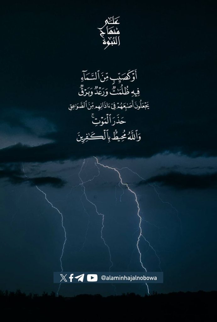 ﴿ أَوْ كَصَيِّبٍ مِّنَ السَّمَاءِ فِيهِ ظُلُمَاتٌ وَرَعْدٌ وَبَرْقٌ يَجْعَلُونَ أَصَابِعَهُمْ فِي آذَانِهِم مِّنَ الصَّوَاعِقِ حَذَرَ الْمَوْتِ ۚ وَاللَّهُ مُحِيطٌ بِالْكَافِرِينَ﴾ [ البقرة: 19]